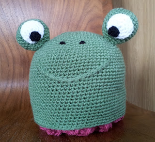 Rob got me an awesome animal hat book for my bday - what a gem. I've made a couple of hybrid items from it by combining patterns like this froggy. Froggy was a gift for Rob's cousin's son on his Christening day.